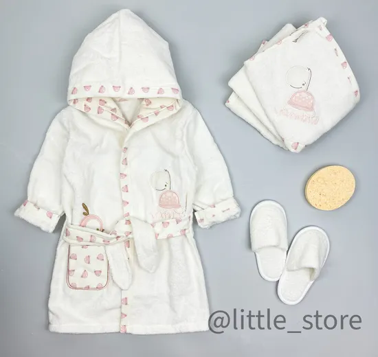 В уютный банный комплект входят: халатик с капюшоном и поясом, полотенце с уголком, тапочки и натуральная мочалка из целлюлозы. Махровое полотно для набора выбрано оптимальной плотности, мягкая и достаточно густая махра, - нежно окутает малыша комфортом и впитает всю влагу, не причинив дискомфорта. Размер халата подходит малышу от 4-6 мес до 2-2,5 лет (длина халата 51 см, ширина 35), полотенце с уголком размером 77 на 73см, тапочки по стопе 17см. Комплект поставляется в аккуратной картонной коробке.