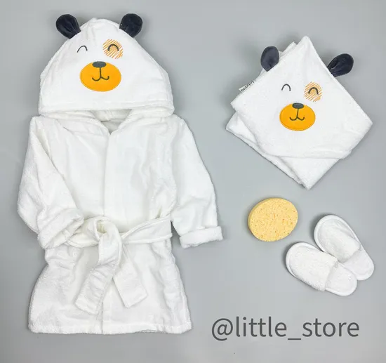 В уютный банный комплект входят: халатик с капюшоном и поясом, полотенце с уголком, тапочки и натуральная мочалка из целлюлозы. Махровое полотно для набора выбрано оптимальной плотности, мягкая и достаточно густая махра, - нежно окутает малыша комфортом и впитает всю влагу, не причинив дискомфорта. Размер халата подходит малышу от 4-6 мес до 2-2,5 лет (длина халата 51 см, ширина 35), полотенце с уголком размером 77 на 73см, тапочки по стопе 17см. Комплект поставляется в аккуратной картонной коробке.