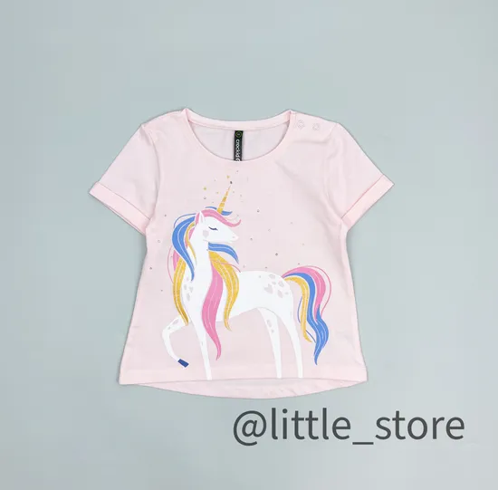 Легкая футболка из нежного трикотажа супрем. Футболка выполнена с короткими втачными рукавами, с принтом на груди, спинка закругленная. Короткие рукава с закрепленными отворотами. Для удобства одевания в 92 и 98 размерах на плече футболка застегивается на кнопки.