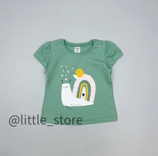 Футболка из мягкого хлопкого трикотажа - интерлок, высшего сорта Пенье. На горловине предусмотрена застежка на кнопки для удобства переодевания. Рукава-фонарики и низ изделия обработаны плоскими швами.