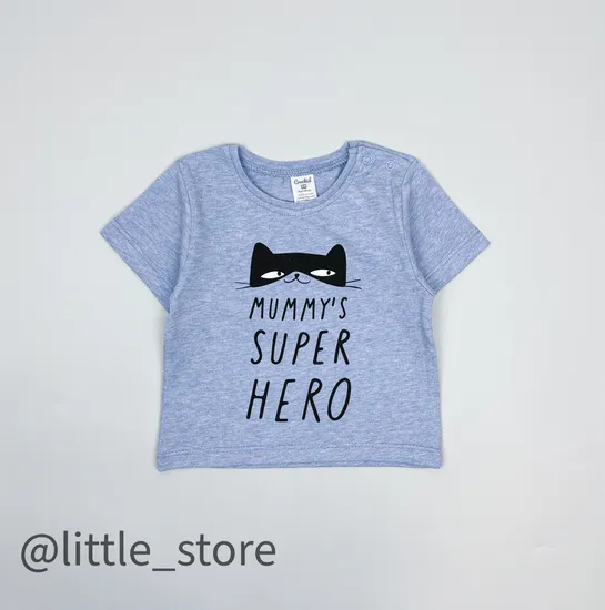 Легкая футболка из нежного трикотажа супрем. Футболка выполнена с короткими втачными рукавами, с принтом на груди. Для удобства одевания на плече футболка застегивается на кнопки.