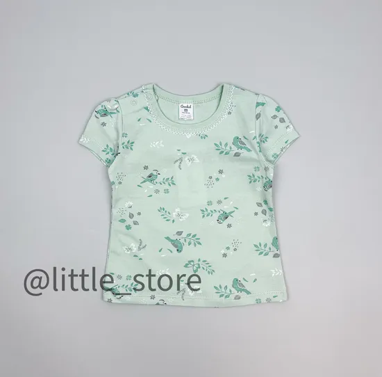 Легкая футболка из нежного трикотажа супрем. Футболка выполнена с короткими втачными рукавами, с принтом на груди. Для удобства одевания на плече футболка застегивается на кнопки.