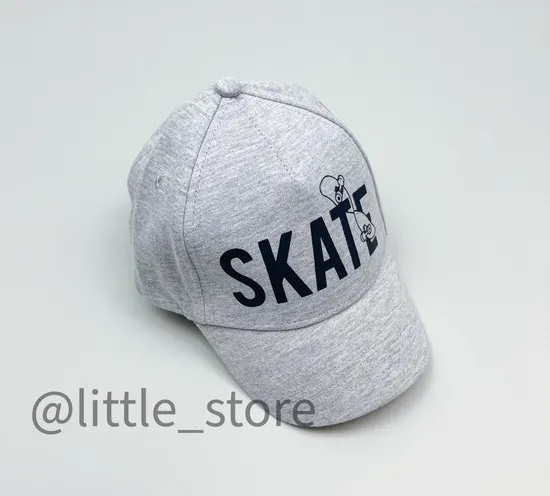 Текстильная кепка из хлопка светло-серого цвета с декоративной отстрочкой. Передняя часть украшена принтом с надписью. Сверху вышитые отверстия. Регулируется по ширине и фиксируется на затылке с помощью металлической застёжки.