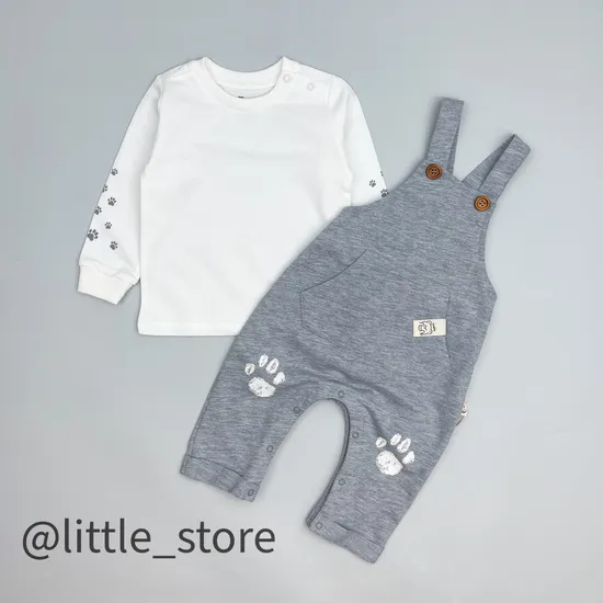 Комбинезон и свитшот выполнены из плотного футера 2-нитки с петлей внутри. Комбинезон на регулируемых бретелях, сзади на поясе резинка, полностью на кнопках между ног. Свитшот с длинным рукавом, на горловине кнопки. Размер комплекта равен росту ребенка.