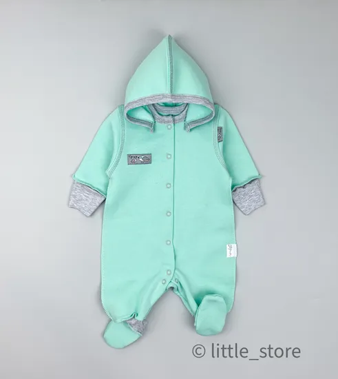 Данный комбинезон изготовлен из теплого трикотажа -3-ниточного футера. Он имеет мягкий начес по изнанке, гипоаллергенен, прекрасно сохраняет тепло, форму, отлично носится, выдерживает многократные стирки, не вытягивается в длину и мало тянется в ширину, особенно важно, что это 100% хлопок. Манжеты-антицарапки работают как трансформеры, легко защищая малыша от царапания и одновременно могут быть обычными манжетами, если в антицарапках нет надобности. Кнопки по всей длине комбинезона удобны и практичны, позволяют легко и быстро переодеть малыша. Капюшон отстегивается, если это необходимо.Вставки на ножках выполнены из однотонного эластичного материала, который мягко фиксирует манжеты на ногах, благодаря этому комбинезон не будет сползать с ножек малыша, также манжеты прячут излишнюю длину изделия.ВНИМАНИЕ! Материал комбинезона с дополнительным утеплением в виде начеса, предварительная стирка ворсом вовнутрь даст эффект ворса барашка. Для удаления несформировавшихся завитков обработать сухой или липкой одежной щеткой и прогладить с изнанки.