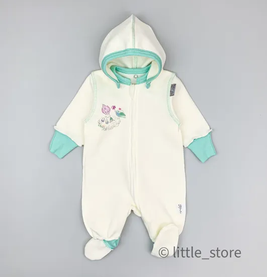 Манжеты-антицарапки работают как трансформеры, легко защищая малыша от царапания и одновременно могут быть обычными манжетами, если в антицарапках нет надобности. Молния по всей длине комбинезона удобна и практична, позволяет легко и быстро переодеть малыша. Капюшон отстегивается, если это необходимо, удобного узкого кроя, заменяет шапочку. Вставки на ножках выполнены из однотонного эластичного материала, который мягко фиксирует манжеты на ногах, благодаря этому комбинезон не будет сползать с ножек малыша, также манжеты прячут излишнюю длину изделия.