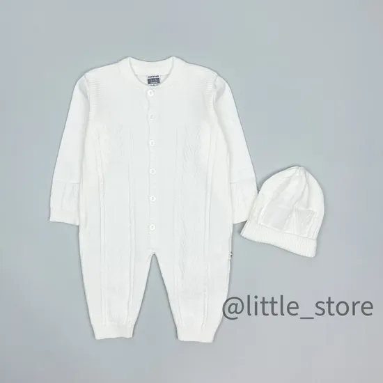 Комбинезон вязаный с шапочкой самого высокого качества, выполнены из 100% хлопковой пряжи. Нарядный комплект  отлично подойдет для выписки и дальнейшего использования. Мягкая и самая нежная пряжа отлично подходит для первого слоя малыша, идеальный состав позволяет надевать комбинезон на голое тело, либо пододеть боди в прохладную погоду. Температурный режим изделия от 18 до 24 градусов. Размер равен росту ребенка, шапочка отлично тянется.
