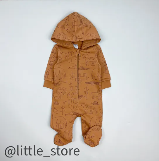 Комбинезон "Я родился" из футера с начесом, Звери на коричневом