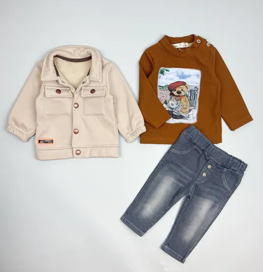 Комплект для мальчика из трех позиций. Курточка из футера с начесом внутри, хлопковый лонгслив и джинсы на эластичной резинке в поясе.