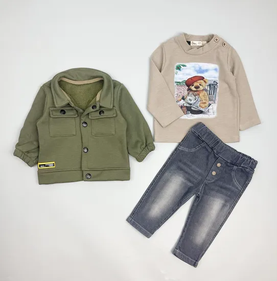 Комплект для мальчика из трех позиций. Курточка из футера с начесом внутри, хлопковый лонгслив и джинсы на эластичной резинке в поясе.