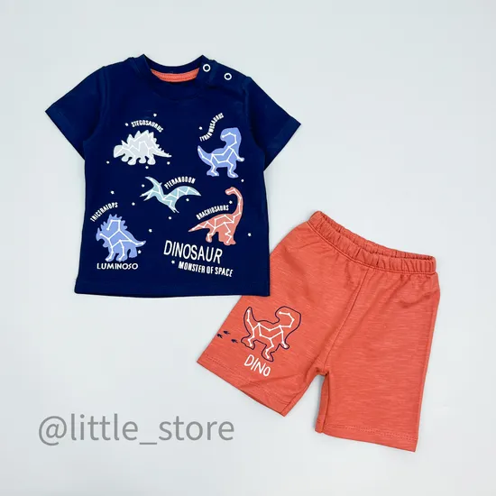 Комплект из футболки и шортиков, выполнен из мягчайшего тонкого дышащего хлопка. Футболка свободного аккуратного кроя с принтом спереди. Шортики выполнены из тонкого футера 2-нитки, такая ткань отлично держит форму и долговечна при эксплуатации. В таком комплекте малышу будет невероятно комфортно в знойную жаркую погоду, комплект не стеснит движений.