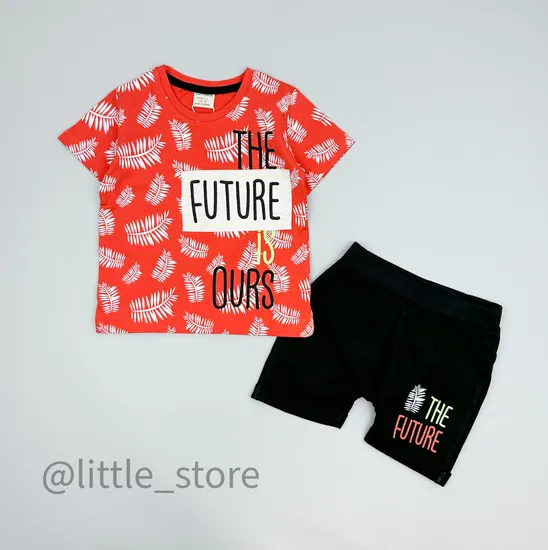 Комплект из футболки и шортиков, выполнен из мягчайшего тонкого дышащего хлопка. Футболка свободного аккуратного кроя с принтом спереди. Шортики выполнены из тонкого футера 2-нитки, такая ткань отлично держит форму и долговечна при эксплуатации. В таком комплекте малышу будет невероятно комфортно в знойную жаркую погоду, комплект не стеснит движений.