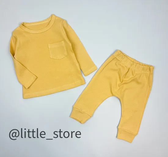 Комплект из лонгслива и штанишек выполнен из приятной вафельной ткани; ткань достаточно плотная, фактурная, очень приятная тактильно, внутри гладкая. Лонгслив имеет эластичную, достаточно широкую горловину, комфортную для переодевания малыша. Штанишки с манжетами и нетугим поясом на талии. Размер равен росту ребенка.