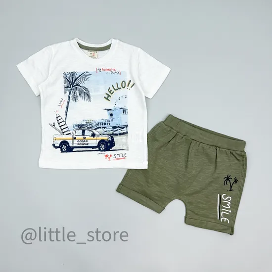 Комплект из футболки и шортиков, выполнен из мягчайшего тонкого дышащего хлопка. Футболка свободного аккуратного кроя с принтом спереди. Шортики выполнены из тонкого футера 2-нитки, такая ткань отлично держит форму и долговечна при эксплуатации. В таком комплекте малышу будет невероятно комфортно в знойную жаркую погоду, комплект не стеснит движений.