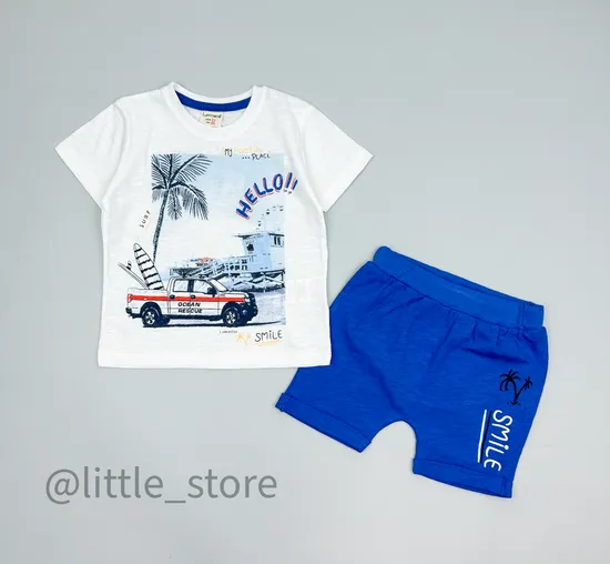Комплект из футболки и шортиков, выполнен из мягчайшего тонкого дышащего хлопка. Футболка свободного аккуратного кроя с принтом спереди. Шортики выполнены из тонкого футера 2-нитки, такая ткань отлично держит форму и долговечна при эксплуатации. В таком комплекте малышу будет невероятно комфортно в знойную жаркую погоду, комплект не стеснит движений.