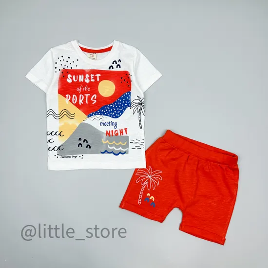 Комплект из футболки и шортиков, выполнен из мягчайшего тонкого дышащего хлопка. Футболка свободного аккуратного кроя с принтом спереди. Шортики выполнены из тонкого футера 2-нитки, такая ткань отлично держит форму и долговечна при эксплуатации. В таком комплекте малышу будет невероятно комфортно в знойную жаркую погоду, комплект не стеснит движений.