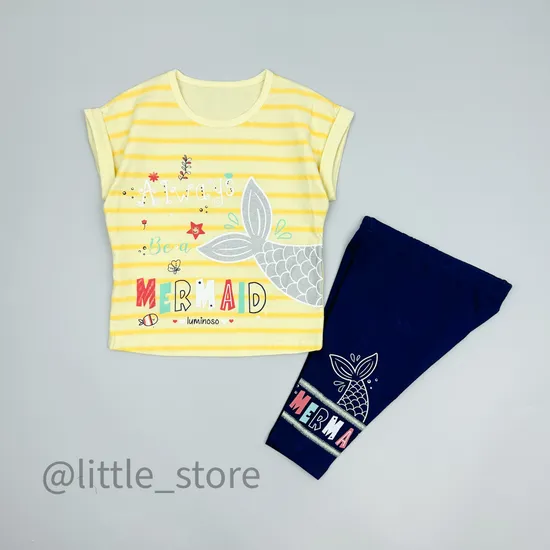 Комплект из футболки и коротких лосин, выполнен из мягчайшего тонкого дышащего хлопка. Футболка и бриджи  свободного аккуратного кроя, украшены принтом. В таком комплекте малышу будет невероятно комфортно в знойную жаркую погоду, комплект не стеснит движений.