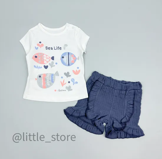 Комплект из футболки и муслиновых шортиков, выполнен из мягчайшего тонкого дышащего хлопка. Футболка и шортики свободного аккуратного кроя, украшены принтом. В таком комплекте малышу будет невероятно комфортно в знойную жаркую погоду, комплект не стеснит движений.