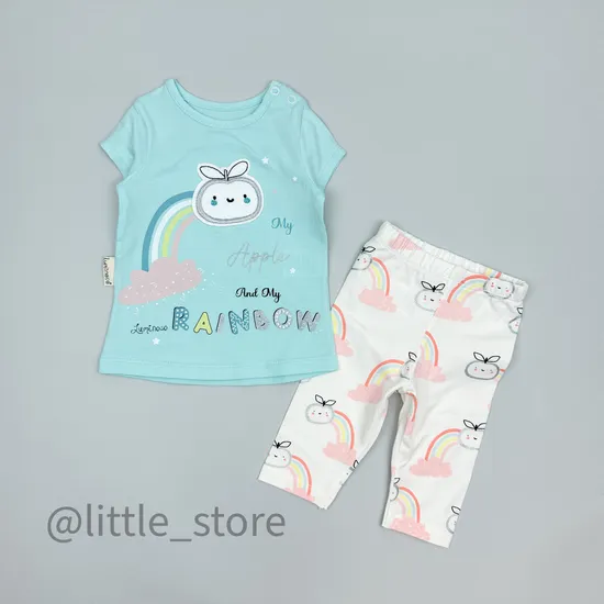 Комплект из футболки и коротких лосин, выполнен из мягчайшего тонкого дышащего хлопка. Футболка и бриджи  свободного аккуратного кроя, украшены принтом. В таком комплекте малышу будет невероятно комфортно в знойную жаркую погоду, комплект не стеснит движений.