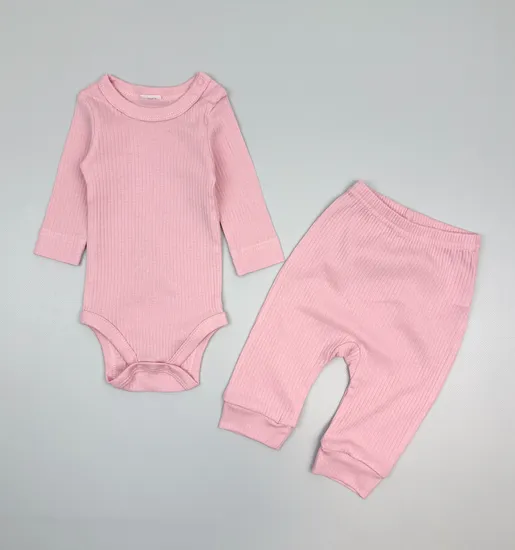 Комплект хлопковый выполнен из тонкого трикотажа - рибана, в рубчик. Мягкая ткань эластичная и комфортная в эксплуатации. Боди с длинным рукавом - застегивается на кнопку на горловине для удобного переодевания; штанишки с высокой посадкой, предусматривающей место для подгузника, манжеты по низу штанин. Размер равен росту ребенка, - 74 размер равен росту 68-74см, 80 размер равен росту 74-80см и тд.