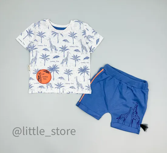 Комплект из футболки и шортиков, выполнен из мягчайшего тонкого дышащего хлопка. Футболка свободного аккуратного кроя из принтованной ткани с нашивкой спереди. Шортики выполнены из тонкого футера 2-нитки, такая ткань отлично держит форму и долговечна при эксплуатации. В таком комплекте малышу будет невероятно комфортно в знойную жаркую погоду, комплект не стеснит движений.