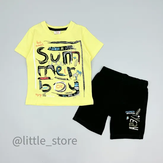 Комплект из футболки и шортиков, выполнен из мягчайшего тонкого дышащего хлопка. Футболка свободного аккуратного кроя с принтом спереди. Шортики выполнены из тонкого футера 2-нитки, такая ткань отлично держит форму и долговечна при эксплуатации. В таком комплекте малышу будет невероятно комфортно в знойную жаркую погоду, комплект не стеснит движений.
