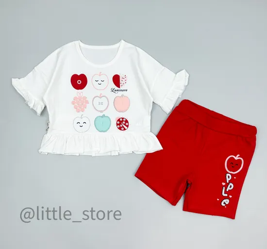 Комплект из футболки и шортиков, выполнен из мягчайшего тонкого дышащего хлопка. Футболка свободного аккуратного кроя с принтом спереди. Шортики выполнены из тонкого футера 2-нитки, такая ткань отлично держит форму и долговечна при эксплуатации. В таком комплекте малышу будет невероятно комфортно в знойную жаркую погоду, комплект не стеснит движений.