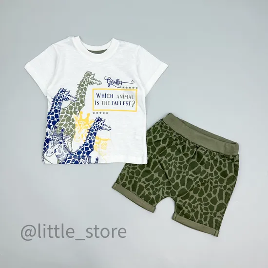 Комплект из футболки и шортиков, выполнен из мягчайшего тонкого дышащего хлопка. Футболка свободного аккуратного кроя с принтом спереди. Шортики выполнены из тонкого футера 2-нитки, такая ткань отлично держит форму и долговечна при эксплуатации. В таком комплекте малышу будет невероятно комфортно в знойную жаркую погоду, комплект не стеснит движений.