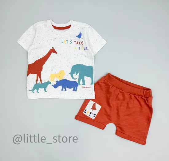 Комплект из футболки и шортиков, выполнен из мягчайшего тонкого дышащего хлопка. Футболка свободного аккуратного кроя с принтом спереди. Шортики выполнены из тонкого футера 2-нитки, такая ткань отлично держит форму и долговечна при эксплуатации. В таком комплекте малышу будет невероятно комфортно в знойную жаркую погоду, комплект не стеснит движений.