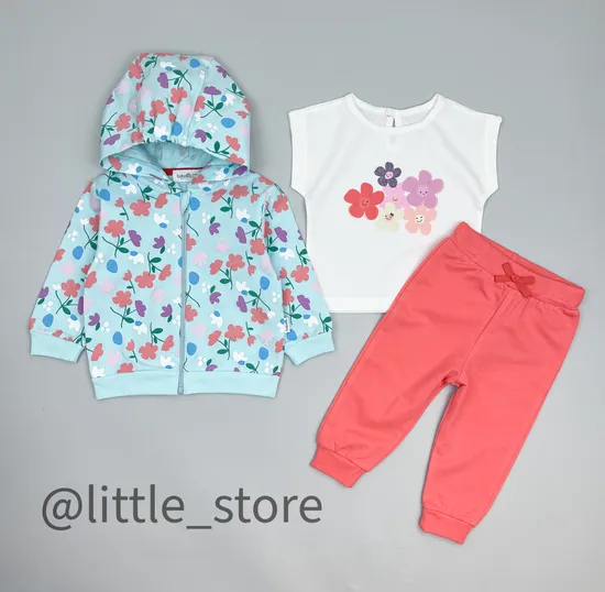 Комплект состоит из толстовки с капюшоном на молнии, футболки с коротким рукавом и штанишек. Кофточка и штаны выполнены из плотного футера двухнитки-петля, футболка из мягкого тонкого хлопка. На кофточке и штанишках предусмотрены манжеты, нетугая резинка на поясе.