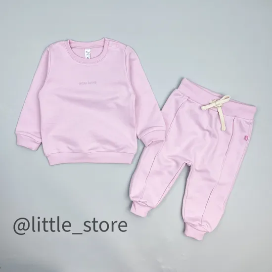 Удобный комплект состоит из лаконичного свитшота и штанишек свободного кроя, выполнен комплект из однотонного трикотажа - футера 2нитки с петлей внутри. Свободный крой максимально удобен для комфорта малыша, не сковыввет движения. Кофточка и штанишки по низу на манжетах, пояс штанов возможно отрегулировать шнурком, у свитшота кнопки на горловине. Штаны спереди оформлены декоративной строчкой. Размер равен росту ребенка при обычном телосложении.