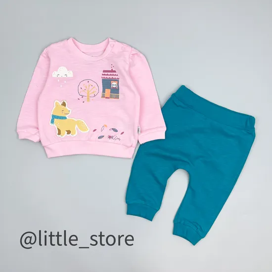 Комплект состоит из свитшота и штанишек. Свитшот и штанишки выполнены из футера 2нитки - с петлей внутри. Для максимального комфорта на горловине свитшота предусмотрены безникелевые кнопки, на штанинах и рукавах предусмотрены манжеты. Размер равен росту ребенка.