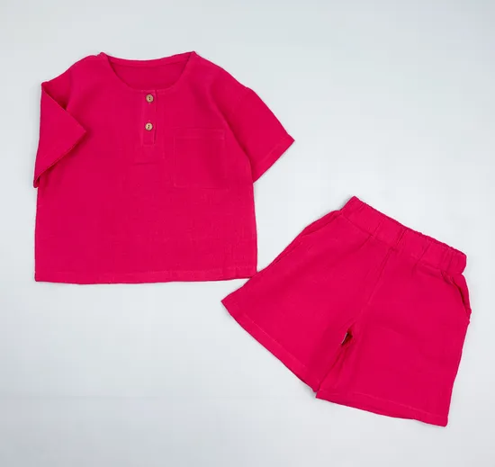 Комплект из рубашки с коротким рукавом и шортиков выполнен из муслиновой ткани. Ткань легкая и тонкая, отлично подходит для знойного лета, при этом выглядит красиво и опрятно. Рубашка с пуговицами на горловине, свободного кроя; шортики с натугой резинкой в поясе, карманами по бокам.