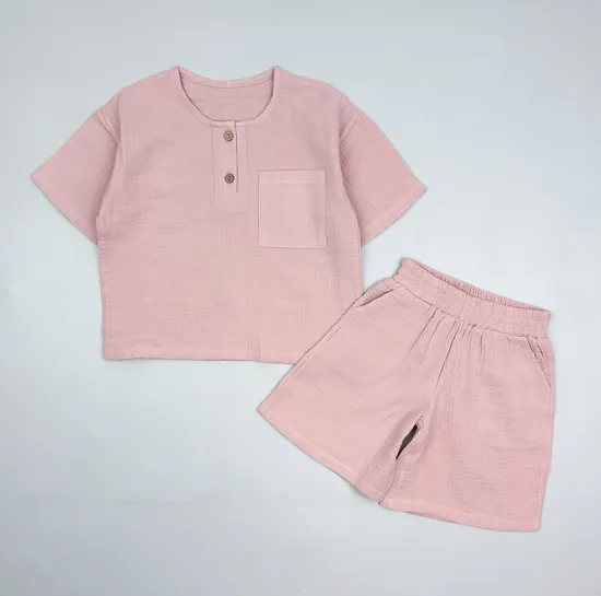Комплект из рубашки с коротким рукавом и шортиков выполнен из муслиновой ткани. Ткань легкая и тонкая, отлично подходит для знойного лета, при этом выглядит красиво и опрятно. Рубашка с пуговицами на горловине, свободного кроя; шортики с натугой резинкой в поясе, карманами по бокам.