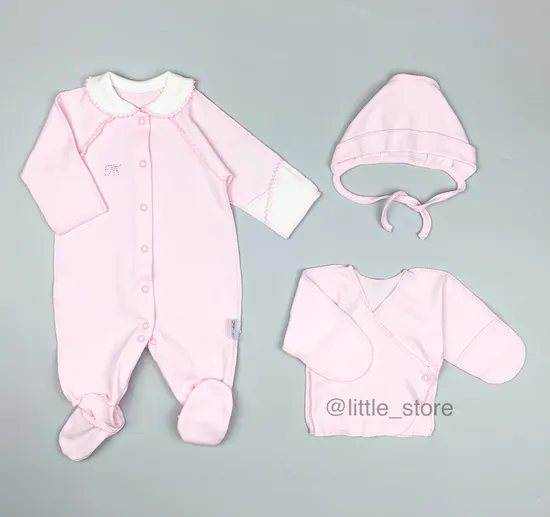 Комфортный трех-предметный комплект для малышей подойдет на выписку из роддома. В его состав входит слип, распашонка и чепчик. Комбинезон и чепчик выполнены изз хлопка-интерлок, а более тонкая распашонка из кулирки, сорта Пенье. Очень удобный крой слипа, деликатный, не мешающий малышу и в то же время нарядный воротничок. Все изделия этого комплекта выполнены швами наружу. Удобные рукавички-трансформеры на комбинезоне выполняют роль антицарапок. Спинка без швов, кнопки по всей длине слипа, мягкие манжеты на ножках, деликатный чепчик, - делают этот комплект просто незаменимым. Комплект пояставляется в подарочной упаковке.