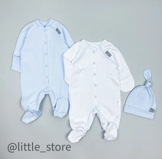 Комплект из двух слипов и шапочки-узелка. Слипы выполнены из хлопка самого высокого качества, сорт Пенье. Слипы интересны своей уникальной функциональностью. Манжеты-антицарапки на первом слипе работают как трансформеры, легко защищая малыша от царапания и одновременно могут быть обычными манжетами, если в антицарапках нет надобности. Удлиненные манжеты позволяют использовать данный комбинезон дольше обычного. У другого слипа на рукавах предусмотрены откидные антицарапки. Воротник и вставки на ножках выполнены из однотонного эластичного материала, который мягко фиксирует манжеты на ногах, благодаря этому слип не будет сползать с ножек малыша, также манжеты прячут излишнюю длину изделия. Кнопки по всей длине комбинезона удобны и практичны, позволяют легко и быстро переодеть малыша. Шапочка подходит к обоим слипам, размер шапочки легко регулировать узелком.
