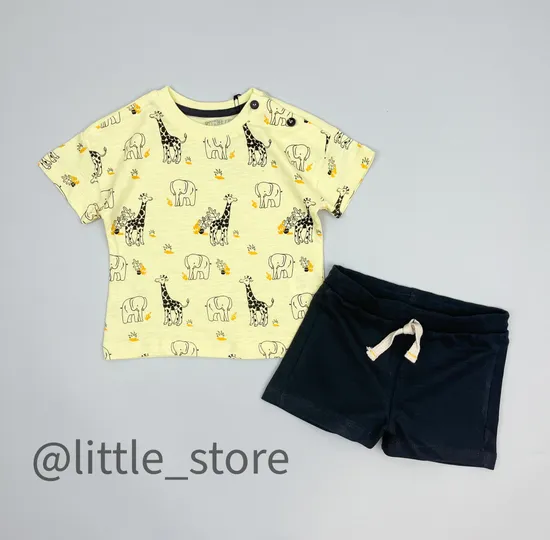 Комплект из футболки и шортиков, выполнен из мягчайшего тонкого дышащего хлопка. Футболка свободного кроя со спущенным плечом и интересным принтом спереди. Шортики выполнены из тонкого и плотного футера, такая ткань отлично держит форму и долговечна при эксплуатации. В таком комплекте малышу будет невероятно комфортно в знойную жаркую погоду, комплект не стеснит движений.