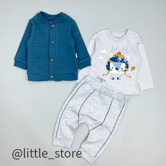 Комплект состоит из курточки из капитония - плотный хлопковый материал, который отлично сохраняет тепло, штанишек из футера 2-нитки с небольшим начесом внутри и хлопкового лонгслива из интерлока. Уютный бомбер застегивается по всей длине на фирменные кнопки, с манжетами по низу и на рукавах для комфорта при эксплуатации; Штанишки выполнены с оригнальной прострочкой, удобного кроя, с нетугой резинкой в поясе; лонгслив с кнопками на горловине. Размер комплекта равен росту ребенка.