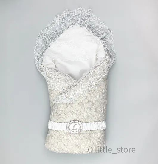 Стильный конверт на выписку и дальнейшее использование. Практичный и функциональный конверт обладает рядом преимуществ: сьемный кружевной уголок, который при желании можно снять; сьемный нарядный поясок с вышитым шевроном застегивается на липучку и тем самым облегчает использование; конверт без нарядного уголка и пояска превращается в полноценное теплое одеяло с пододеяльником. Благодаря молнии на внутренней стороне конверта - одеяло можно вытащить и получить более легкий вариант пледика, на теплое время года. Размер конверта-одеяла 85см х 85см.
