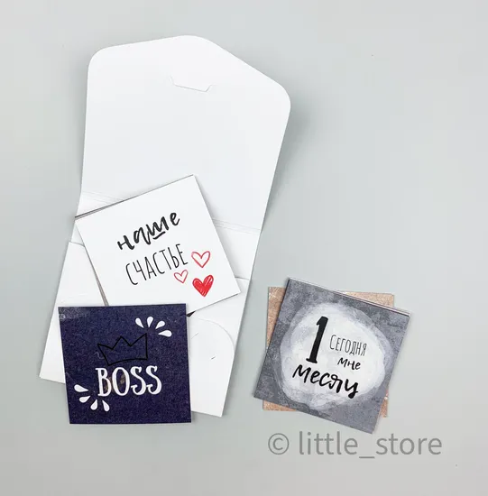 Набор из 24 открыток создан для того, чтобы сохранить драгоценные моменты того, как растет малыш. Просто красиво нарядите малыша, рядом положите карточку и фотографируйте. В наборе 12 открыток на каждый месяц крохи, начиная с рождения. Большое преимущество этих карточек - оборотная сторона, на которой необходимо указать памятные даты. и еще 12 двусторонних карточек с интересными фразами, на каждой стороне фраза. Карточки выполнены из плотного и качественного картона, рисунок нанесен безопасными красками. Открытка не бликует на фото. Каждый комплект поставляется в красивом фирменном картонном конверте, в котором удобно хранить и беречь открыточки.