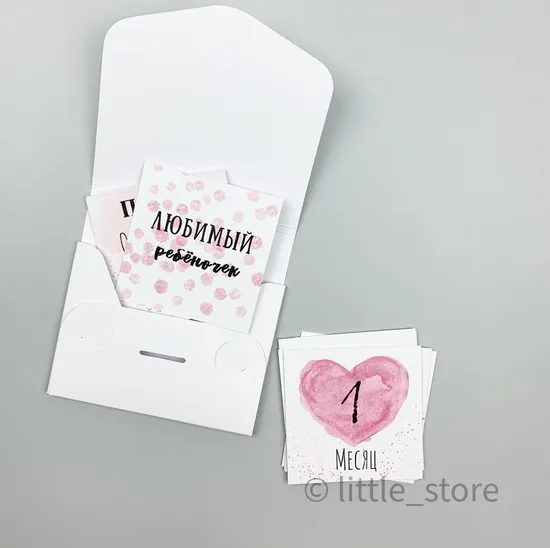 Набор из 24 открыток создан для того, чтобы сохранить драгоценные моменты того, как растет малыш. Просто красиво нарядите малыша, рядом положите карточку и фотографируйте. В наборе 12 открыток на каждый месяц крохи, начиная с рождения. Большое преимущество этих карточек - оборотная сторона, на которой необходимо указать памятные даты. и еще 12 двусторонних карточек с интересными фразами, на каждой стороне фраза. Карточки выполнены из плотного и качественного картона, рисунок нанесен безопасными красками. Открытка не бликует на фото. Каждый комплект поставляется в красивом фирменном картонном конверте, в котором удобно хранить и беречь открыточки.