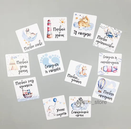 Набор из 12 открыток создан для того, чтобы сохранить драгоценные моменты того, как растет малыш. Просто красиво нарядите малыша, рядом положите карточку с нужным месяцем и фотографируйте. В наборе 12 открыток на каждое достижение крохи. Большое преимущество этих карточек - оборотная сторона, на которой необходимо указать памятные даты. Карточки выполнены из плотного и качественного картона, рисунок нанесен безопасными красками. Каждый комплект поставляется в красивом картонном конверте, в котором удобно хранить и беречь открыточки.