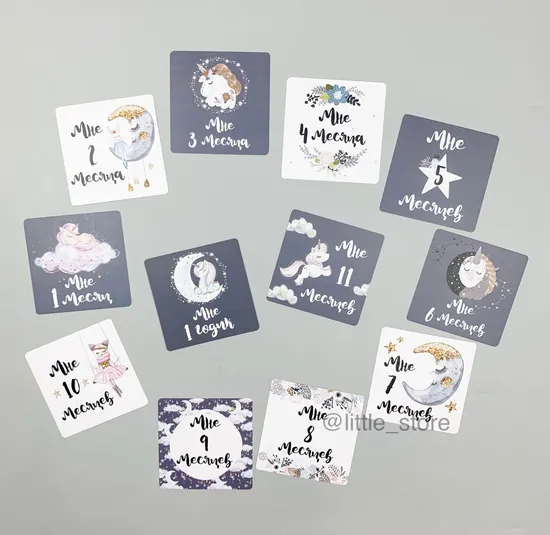 Набор из 12 открыток создан для того, чтобы сохранить драгоценные моменты того, как растет малыш. Просто красиво нарядите малыша, рядом положите карточку с нужным месяцем и фотографируйте. В наборе 12 открыток на каждый месяц крохи, начиная с рождения. Большое преимущество этих карточек - оборотная сторона, на которой необходимо указать памятные даты. Карточки выполнены из плотного и качественного картона, рисунок нанесен безопасными красками. Каждый комплект поставляется в красивом картонном конверте, в котором удобно хранить и беречь открыточки.
