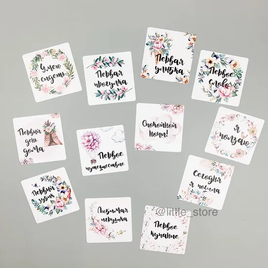 Набор из 12 открыток создан для того, чтобы сохранить драгоценные моменты того, как растет малыш. Просто красиво нарядите малыша, рядом положите карточку с нужным месяцем и фотографируйте. В наборе 12 открыток на каждое достижение крохи. Большое преимущество этих карточек - оборотная сторона, на которой необходимо указать памятные даты. Карточки выполнены из плотного и качественного картона, рисунок нанесен безопасными красками. Каждый комплект поставляется в красивом картонном конверте, в котором удобно хранить и беречь открыточки.