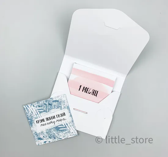 Набор из 24 открыток создан для того, чтобы сохранить драгоценные моменты того, как растет малыш. Просто красиво нарядите малыша, рядом положите карточку и фотографируйте. В наборе 12 открыток на каждый месяц крохи, начиная с рождения. Большое преимущество этих карточек - оборотная сторона, на которой необходимо указать памятные даты. и еще 12 двусторонних карточек с интересными фразами, на каждой стороне фраза. Карточки выполнены из плотного и качественного картона, рисунок нанесен безопасными красками. Открытка не бликует на фото. Каждый комплект поставляется в красивом фирменном картонном конверте, в котором удобно хранить и беречь открыточки.