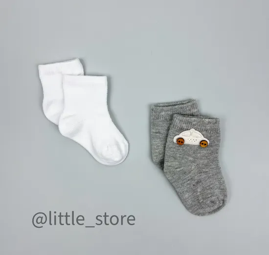 Комплект носочков из 2-х пар. Нежные и мягчайшие однотонные носочки самого высокого качества подойдут абсолютно под любой образ и сохранят ноги малыша в комфорте. Одна пара в комплекте украшена аппликацией машинки, другая без украшения. На всех носочках мягкая резинка, которая абсолютно не пережимает ножку малыша. Носочки прекрасно носятся, надолго сохраняют первоначальный внешний вид. Размер носков равен возрасту ребенка, тк носки прекрасно тянутся и долго служат малышам; если у малыша пухлые ножки или пограничный рост - рекомендуем выбрать бОльший размер. Для сохранности внешнего вида рекомендуем стирать носки на изнаноченой стороне.