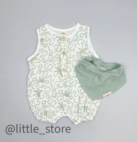 Стильный песочник выполнен из мягкого двухслойного муслина. Изделие мягкое, отлично пропускает воздух. Песочник достаточно обьемного кроя, не причинит дискомфорта малышу при эксплуатации. Для комфортного переодевания застегивается на пуговицы на груди и на кнопки между ног. В комплекте нагрудник в тон из 4-хслойного муслина, застегвается на кнопку.