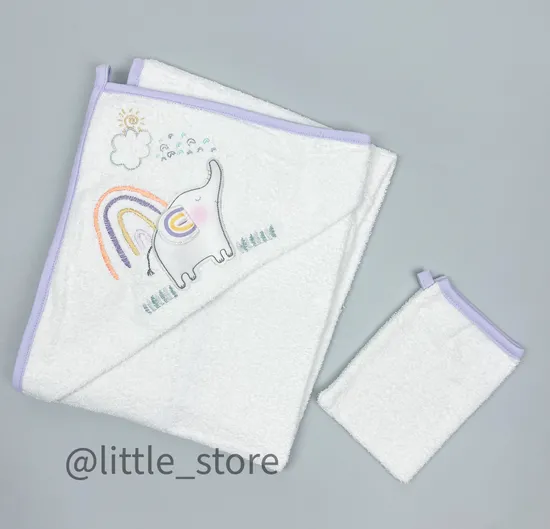 Красивое и мягкое полотенце выполнено из плотного, густого, махрового хлопка самого высокого качества, прекрасно впитывает влагу, не оставляет неприятной махры на теле. На полотенце предусмотрен глубокий капюшон для головы и петелька. В комплекте с полотенцем махровая рукавица-мочалка для малыша. Большой размер полотенца позволит укутать всего малыша, подойдет для ребенка от рождения до 2-4 лет