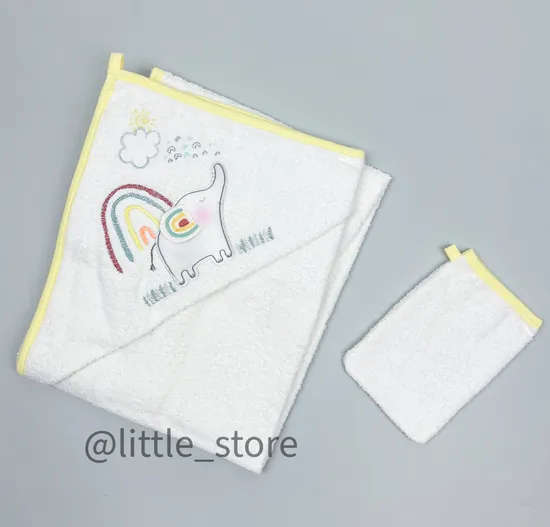 Красивое и мягкое полотенце выполнено из плотного, густого, махрового хлопка самого высокого качества, прекрасно впитывает влагу, не оставляет неприятной махры на теле. На полотенце предусмотрен глубокий капюшон для головы и петелька. В комплекте с полотенцем махровая рукавица-мочалка для малыша. Большой размер полотенца позволит укутать всего малыша, подойдет для ребенка от рождения до 2-4 лет