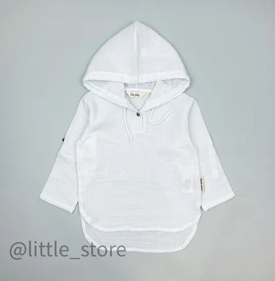 Рубашка выполнена из муслина самого высокого качества. Рубашка с регулируемым капюшоном и длинными рукавами, которые можно отрегулировать на нужную длину. Рубашка идеальна для знойного жаркого лета, будет незаменимой на отдыхе/пляже - надежно закрывает уязвимые части тела от солнца. Изделие свободно сидит на ребенке, не сковыввет движения.